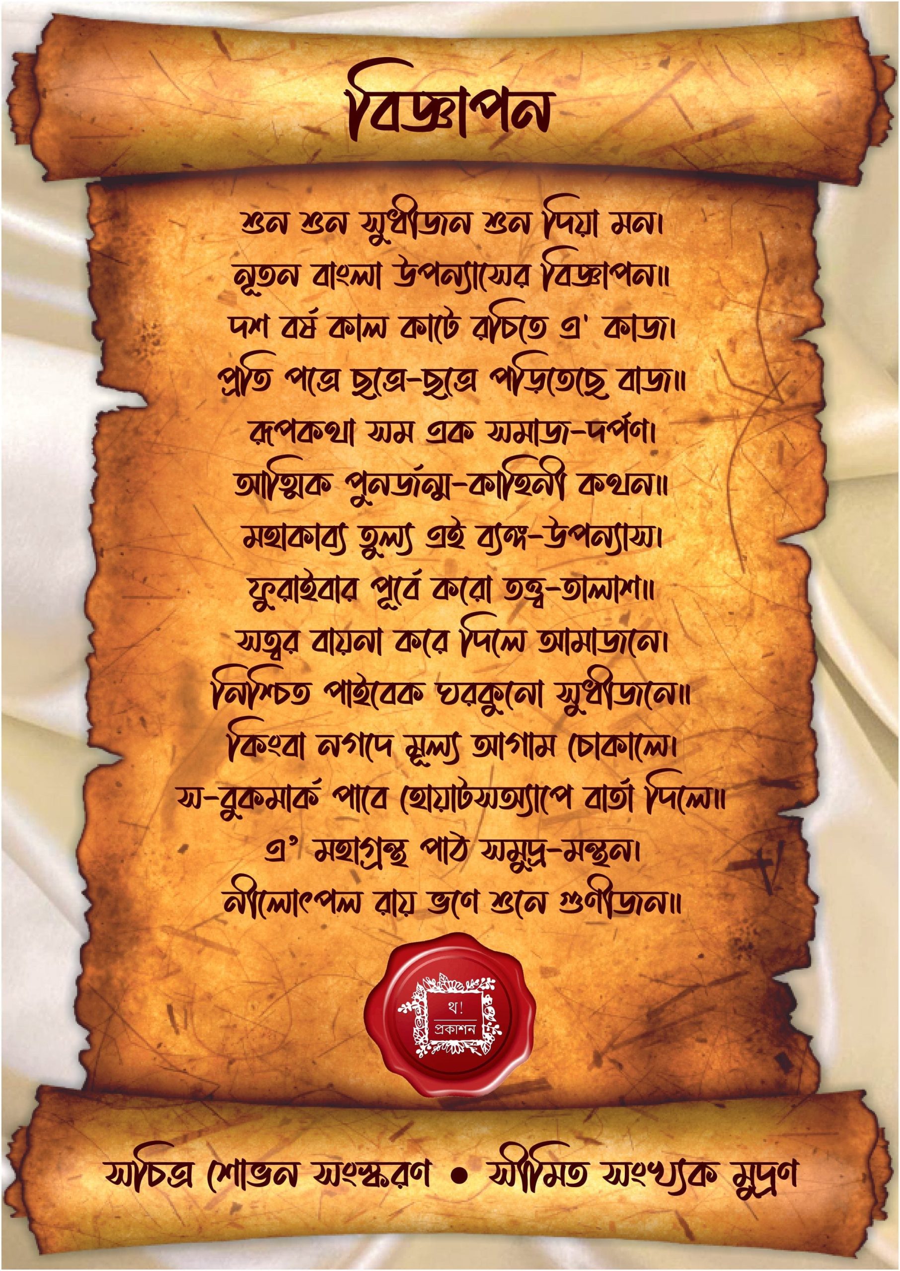 A novel composed of three lakhs and forty-six thousand words, written over a period of ten years, ransacking fifteen libraries, one state archive, one national archive, one international archive, and collecting books from eight antiquarian booksellers, and consulting four erudite scholar writers, and recording reminiscences from five octogenarians. This book is written in an amusing, extravagant, and epical-satirical vein, featuring immense erudition, as well as limitless street-slangs, simultaneously, and is aptly comparable to the works of Francois Rabelais and James Joyce; and in this work, magic realism and fantasy occur against the background of life of the Bengalee race in the Indian socio-political system of the first decade of the 21st century. It’s not a story of love and sacrifice, rather it’s a story of atonement and retribution; it’s not a story of revenge, rather it’s a story of justice.